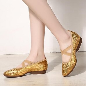 Ballerines en maille pailletée dorée pour femmes avec dentelle brodée - chaussures de danse professionnelles pour les performances sur scène, les entraînements de salon et les récitals