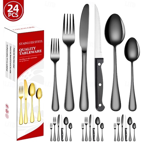 24Pcs Stainless Steel Christmas Cutlery Set Knife Fork Spoon Tableware Western Dinner Utensils Holiday Gift Box Set for Christmas Party