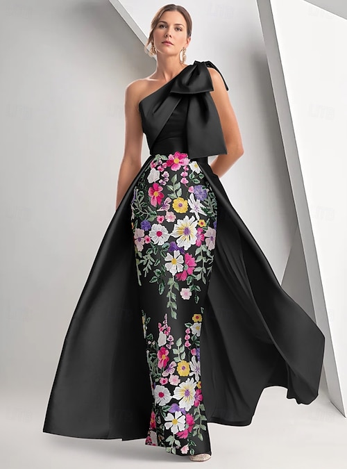 A-Line Floor Length Beaded Eembroidered Formal Dresses Mother of the Bride Dress Evening Gown Elegant Vintage Glittering Sleeveless One Shoulder Wedding Formal Satin with Bow(s) Slit