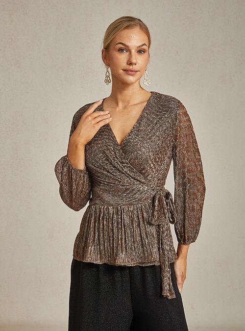 Pentru femei Topuri înfășurate Bluză Sheer Topuri imbracate Plisată Metalic Elegant Petrecere Stilat Manșon Lung Manșon de lanternă În V Topuri obișnuite Invitat la nunta Îmbrăcăminte de seară de