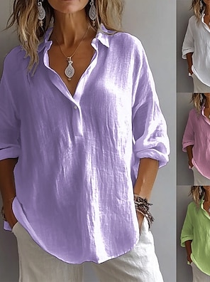 Dam Skjorta Linneskjortor i bomull Ensfärgat Slät Elegant Semester Vintage Långärmad Långa toppar Dagligen Utomhus Streetwear Blå Rödvin Svart Vit Gul Sommar Vår Höst
